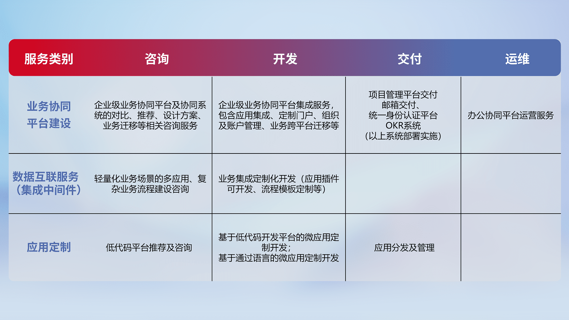 针对钉钉、、企微、、、IDaas等平台级产品提供产品的规划、、、、方案、、、交付、、、、定制化开发等服务,,,,实现如统一协同办公、、智能客户服务、、、混合会议管理、、、智能数据查询、、等业务场景,,,,实现数字化转型。。。。