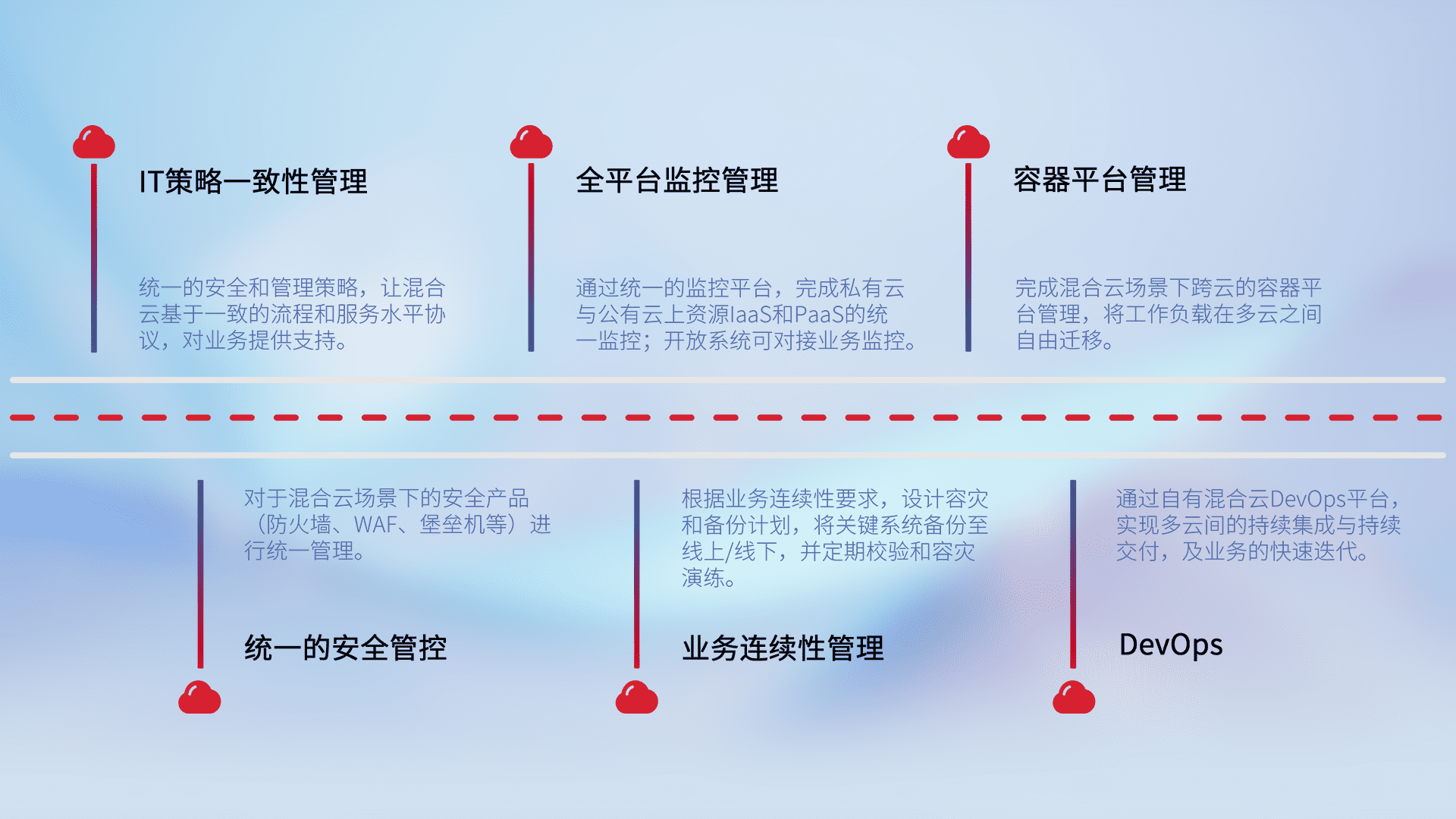 通过多云纳管,,以统一的资源数据模型把客户的云资源进行抽象和封装,,进而实现对多云资源的统一操作,,,保障云资源管理的可靠性、、稳定性与可用性。。量身定制化运维内容,,配置、、、开发运维、、、补丁管理、、备份、、、监控、、、认证和访问管理、、、审计和日常巡检等,,,保障在用云过程中的可靠度,,,,稳定度以及高可用率。。。